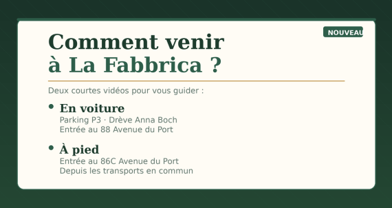 Tour & Taxis peut être un peu labyrinthe la première fois ! On a filmé deux courtes vidéos pour vous guider jusqu'à La Fabbrica, en voiture et à pied.